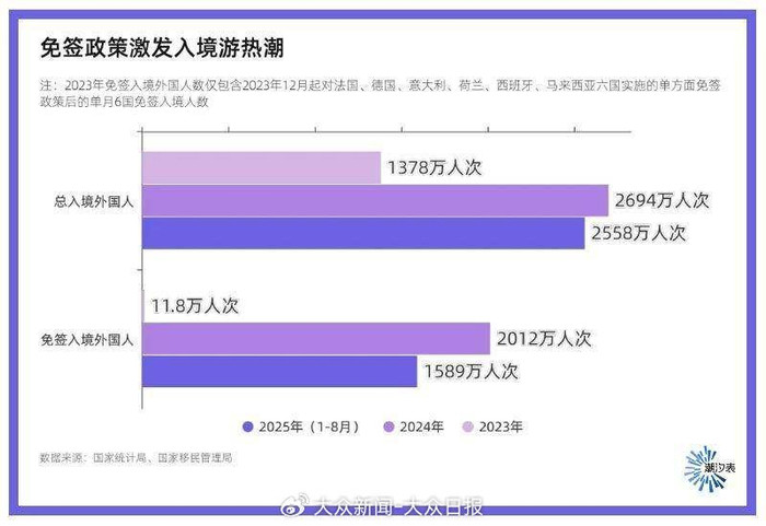 与此同时,2025年1-8月免签入境外国人达1589万人次,同比上升52.1%。这一数据已接近2024年全年入境游客总量,预示着2025年有望创下入境游历史新高。