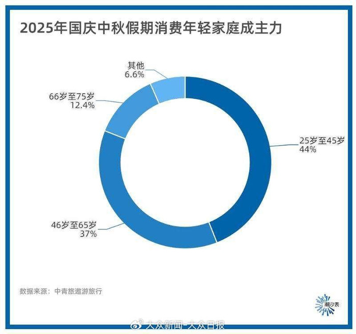 从出行人群来看,国庆假期以年轻家庭出行为主,其中25岁-45岁的年轻客群占比44%,46岁-65岁客群的占比约37%,66岁-75岁老年客群占比12.4%,年轻家庭出行或带父母出行成为国庆假期消费主力人群。