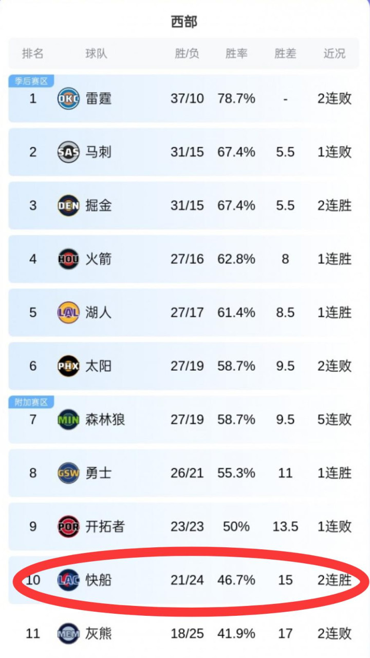 距离西部第八的差距只有几个胜场,附加赛的席位已经看得见摸得着了。
