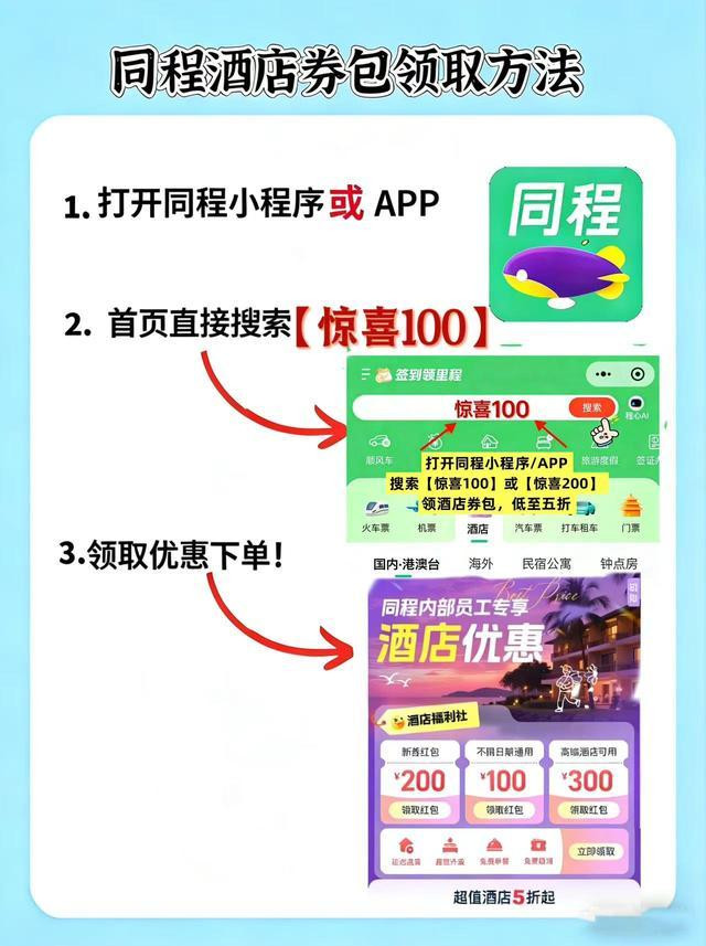 1.同程小程序搜[惊喜100]领酒店全能大额券,覆盖所有商务酒店、连锁酒店和各类民宿,无隐藏限制,领取后直接下单就能抵扣,不管是商务出差还是日常出行,都能用上,是打工人订房的必备券。