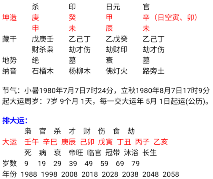 28-38岁走庚辰财杀大运,七杀出现,辰伏吟日支,且为华盖大运,感情孤独,夫妻少言。