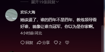 不仅如此,还有人说“孙颖莎该退役了,谁的四年不是四年,教练领导看好谁,就想让谁当冠军,你以为是你家的啊?”
